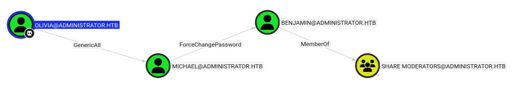Olivia has genericAll over Michael which can ForceChangePassword on Benjamin who is a memberOf "SHARE MODERATORS".