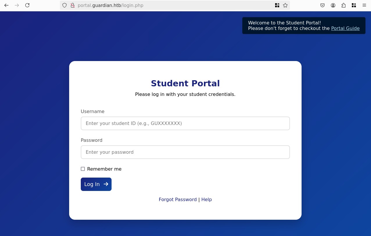 The website is horribly slow when the banner is in view, not sure why, though it's a basic information page that has a button to a "Student portal", it redirects to landing.guardian.htb. Unfortuantely we get a 403, I tried acessing index, login or 404 pages nothing, it seems to really block all access.