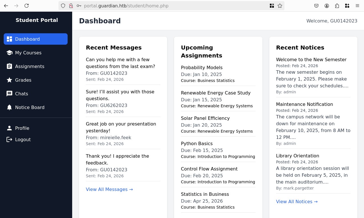 Looking around we see we need user IDs to login, the emails from before gave us 3 IDs, though we need passwords, there's a "Portal Guide" pdf that explains that the default password is GU1234.