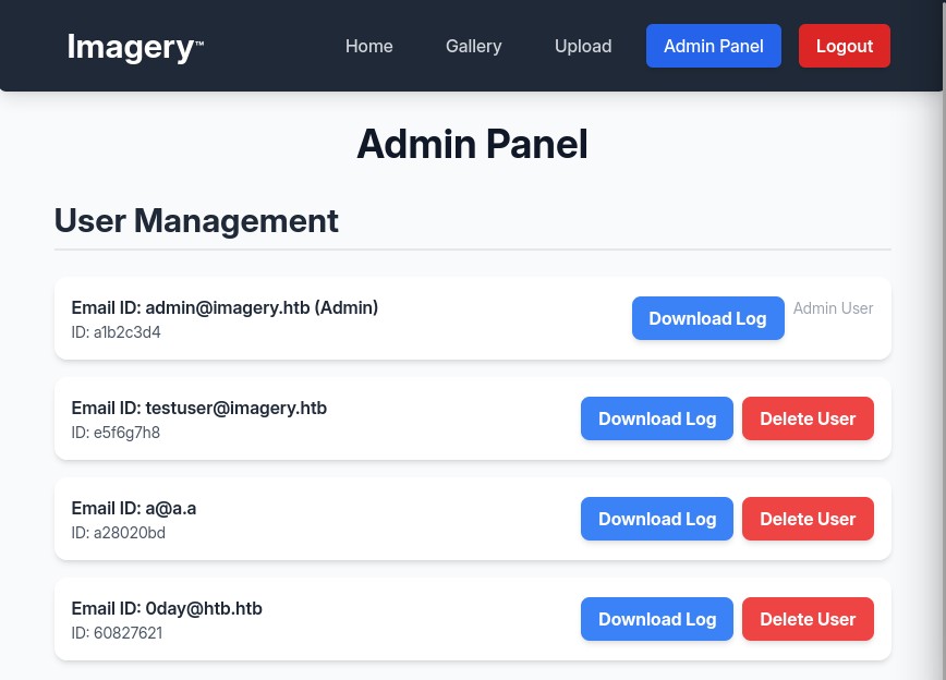 {"anyAdminExists":true,"success":true,"users":[{"displayId":"a1b2c3d4","isAdmin":true,"isTestuser":false,"username":"admin@imagery.htb"},{"displayId":"e5f6g7h8","isAdmin":false,"isTestuser":true,"username":"testuser@imagery.htb"},
