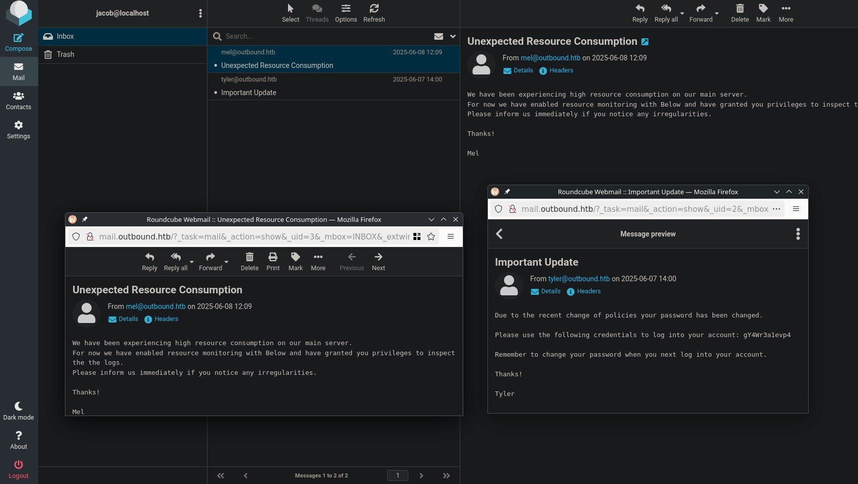 Great, so we learn of the real jacob password: jacob:gY4Wr3a1evp4 and that they have been provided privileges to read logs to review an anomaly causing high server load.